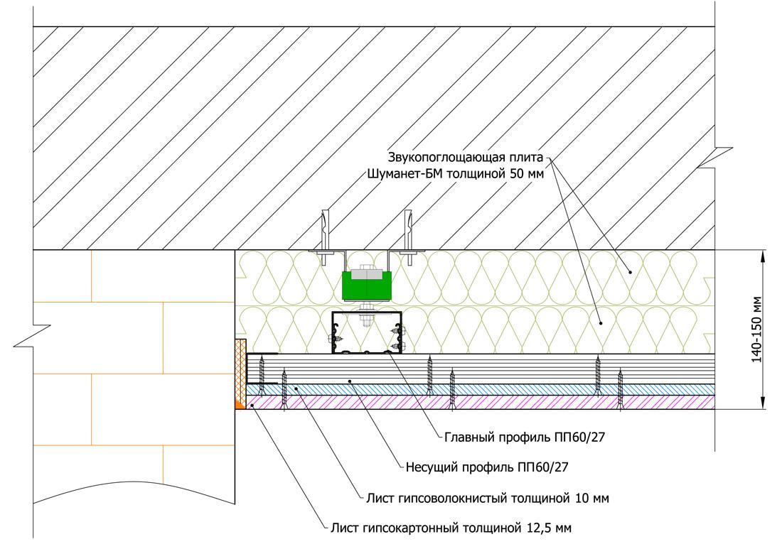 2 слоя Шуманет, один к потолку грибами, второй на главном профиле = 100 мм